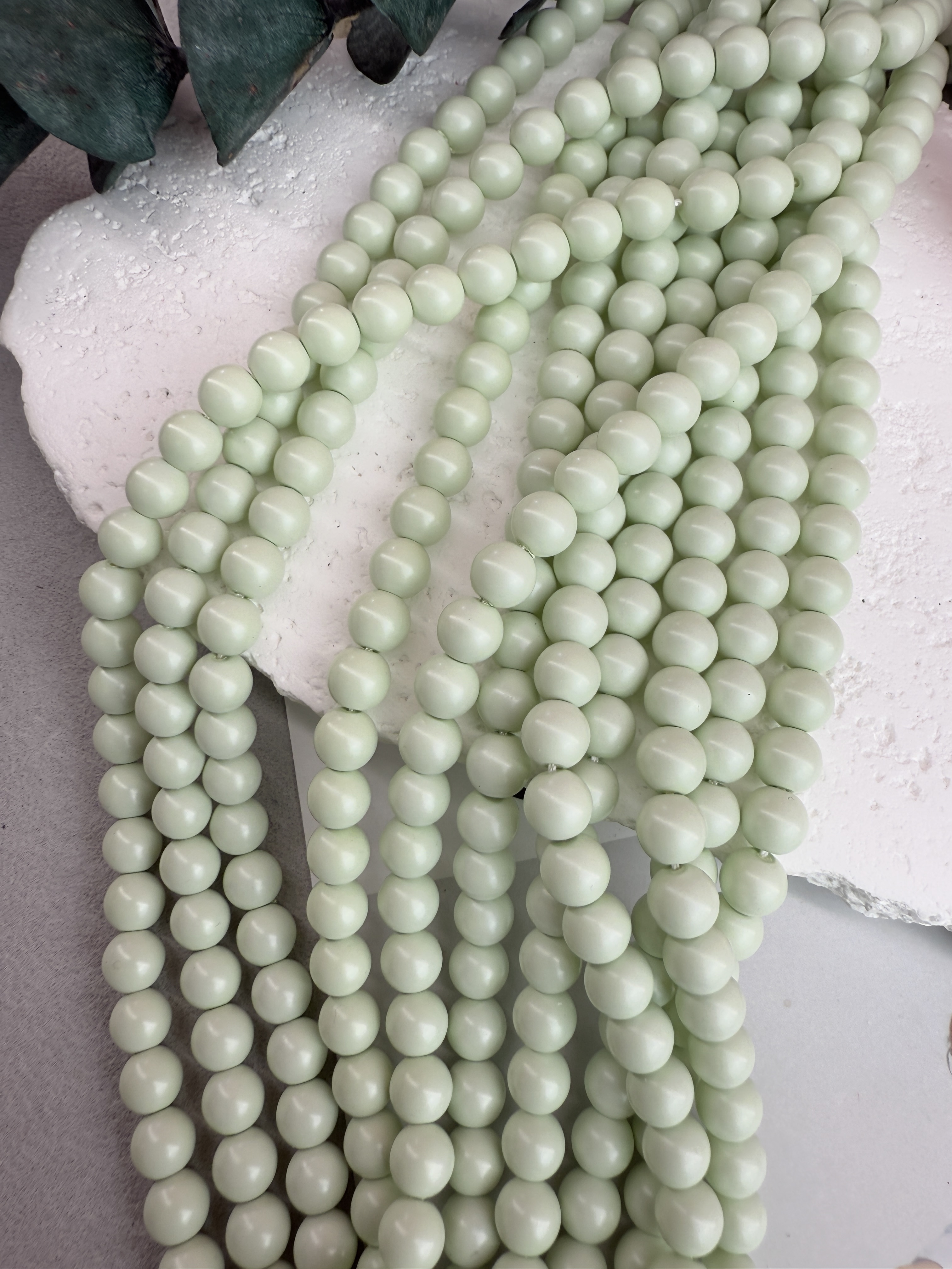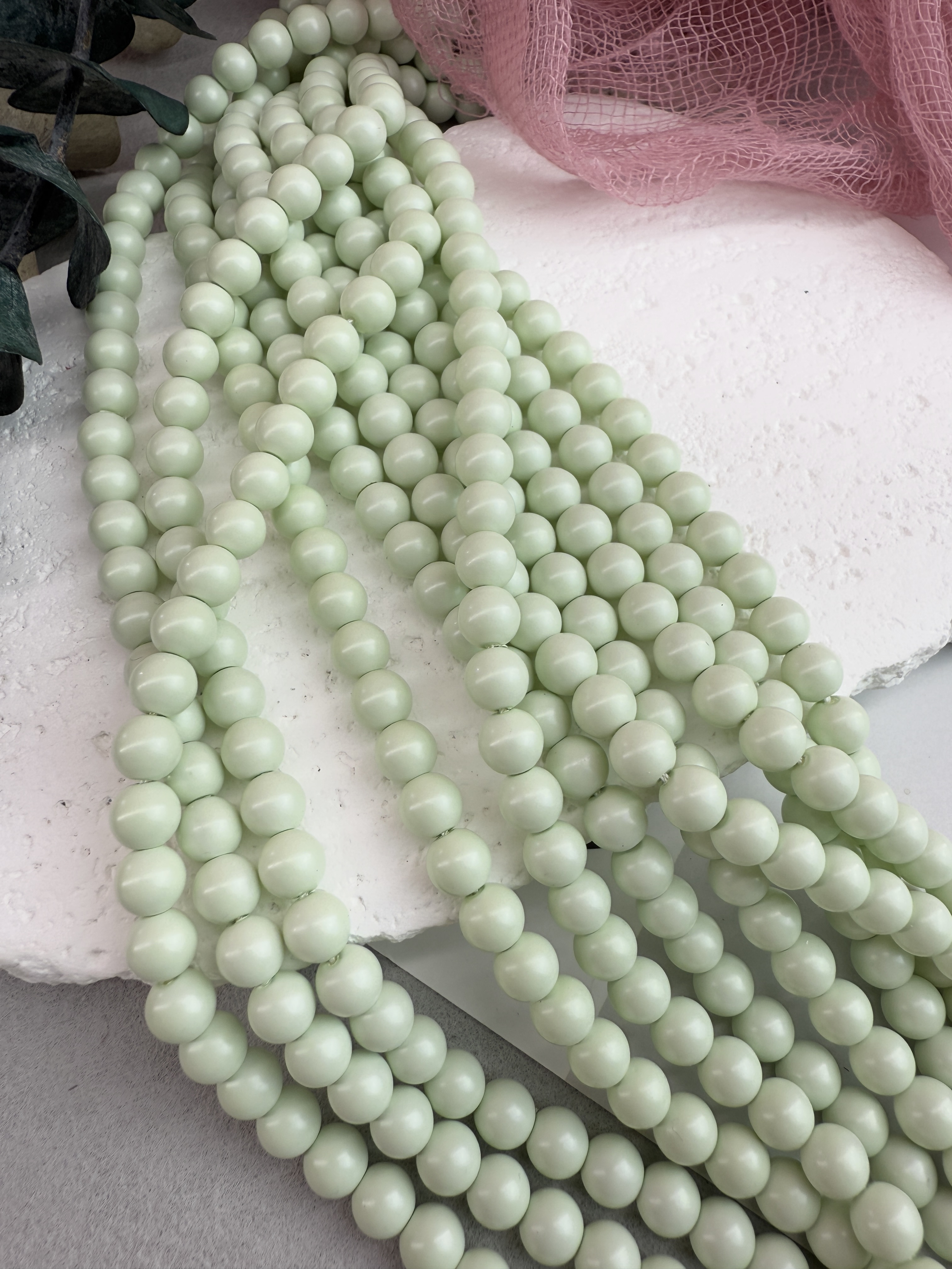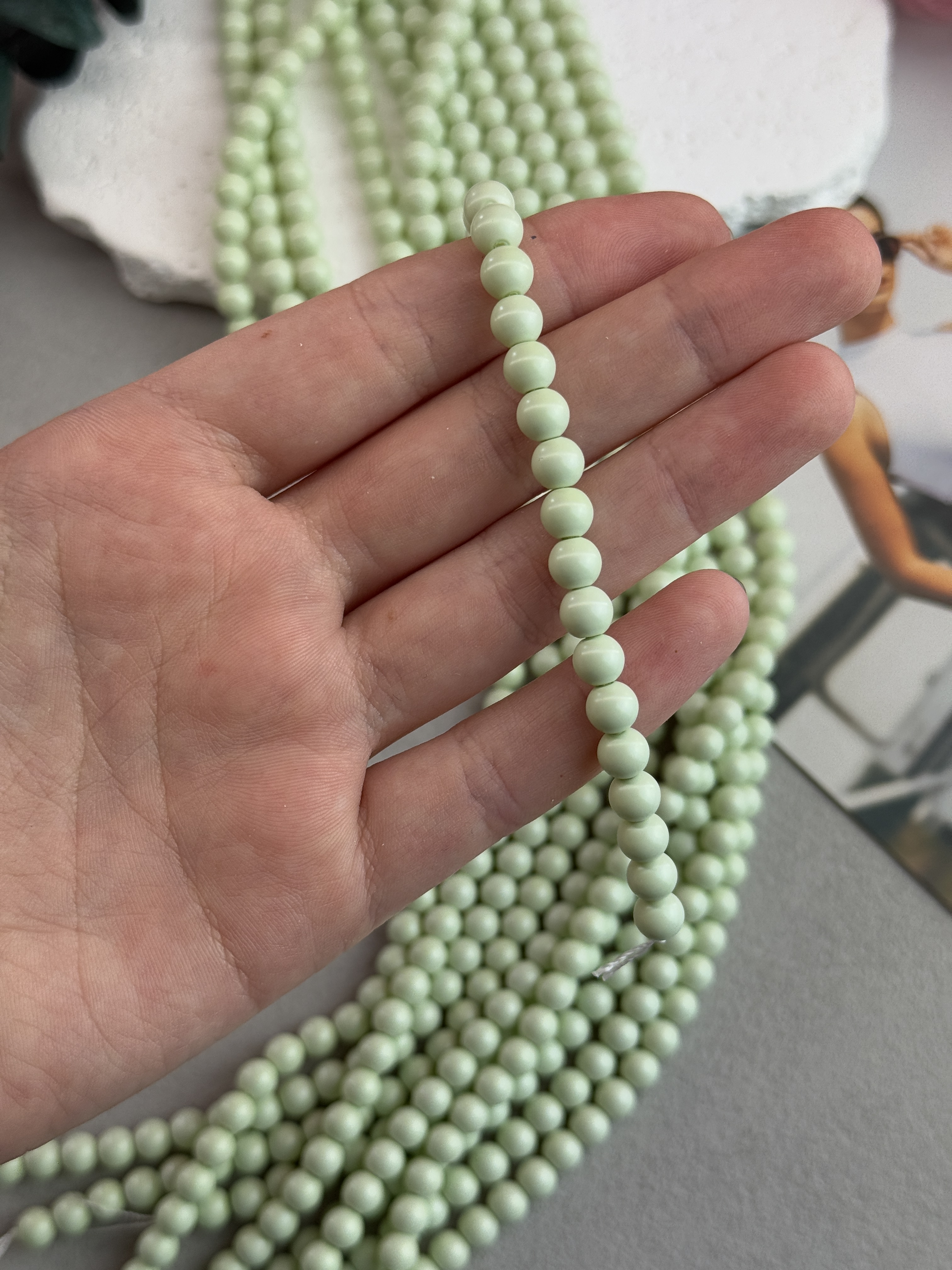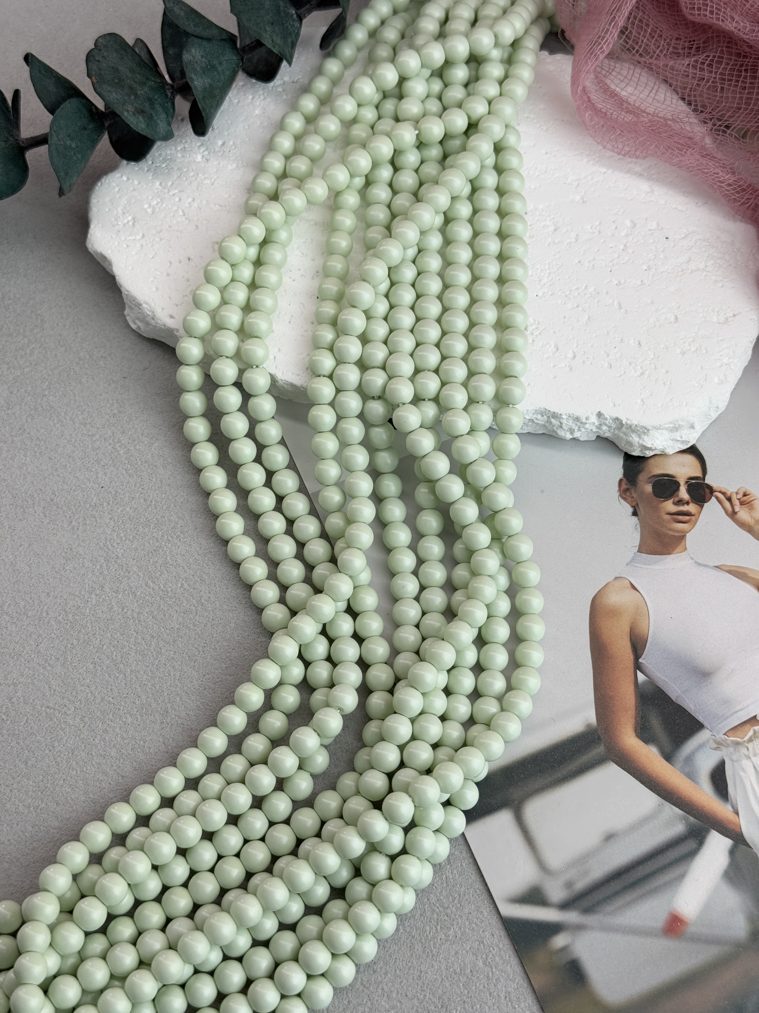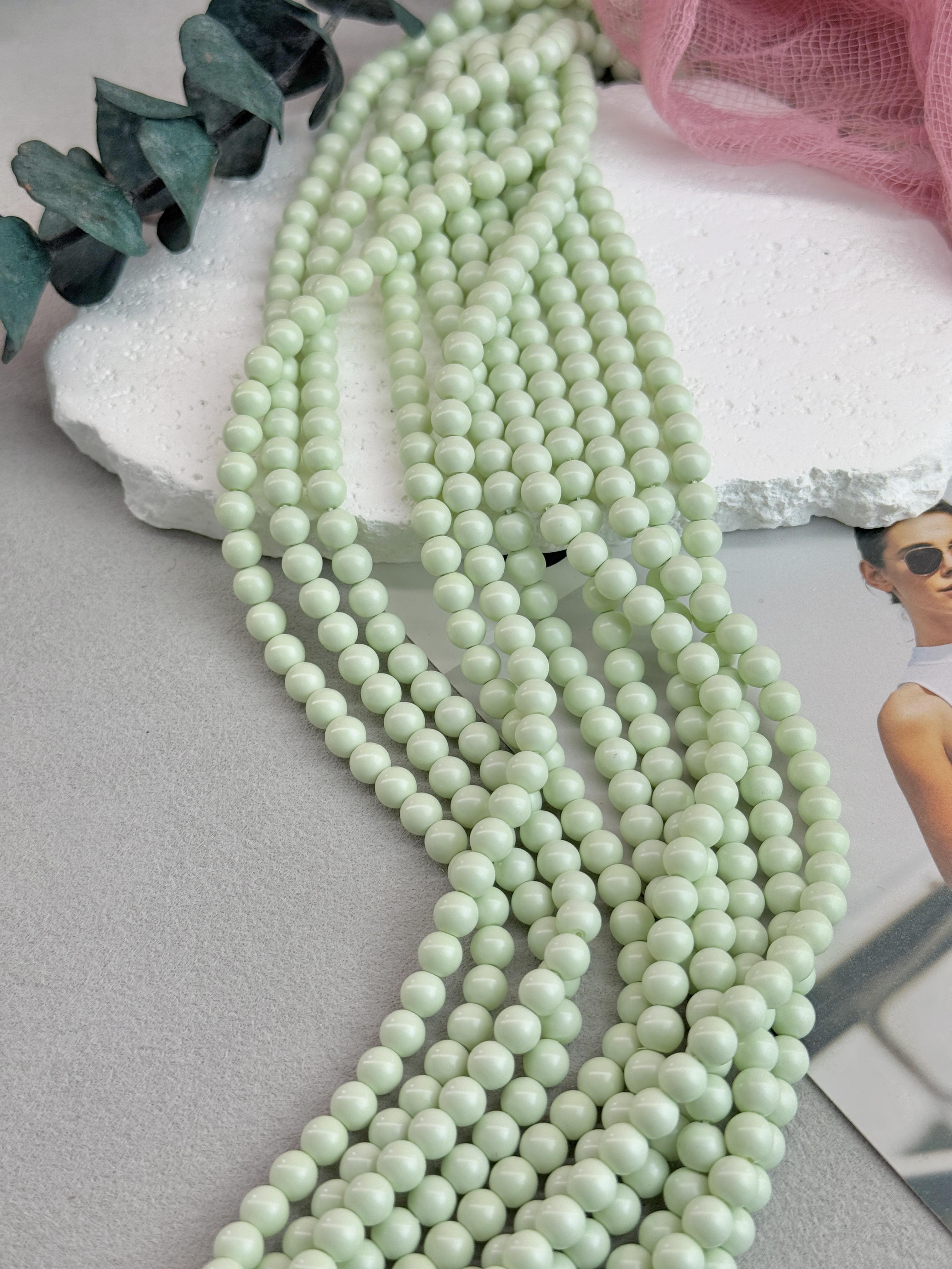 Стеклянный жемчуг с цветным покрытием под керамику. Продается на нити или россыпью. Нить около 38 см (может отличаться в несколько сантиметров в зависимости от партии). Подходит для вышивки и сборки украшений ручной работы таких как колье, серьги, ободки (не рекомендуем использовать данных жемчуг в браслетах и подвесах, а также других украшениях, где возможно сильное трение изделия). Размер 6 мм.