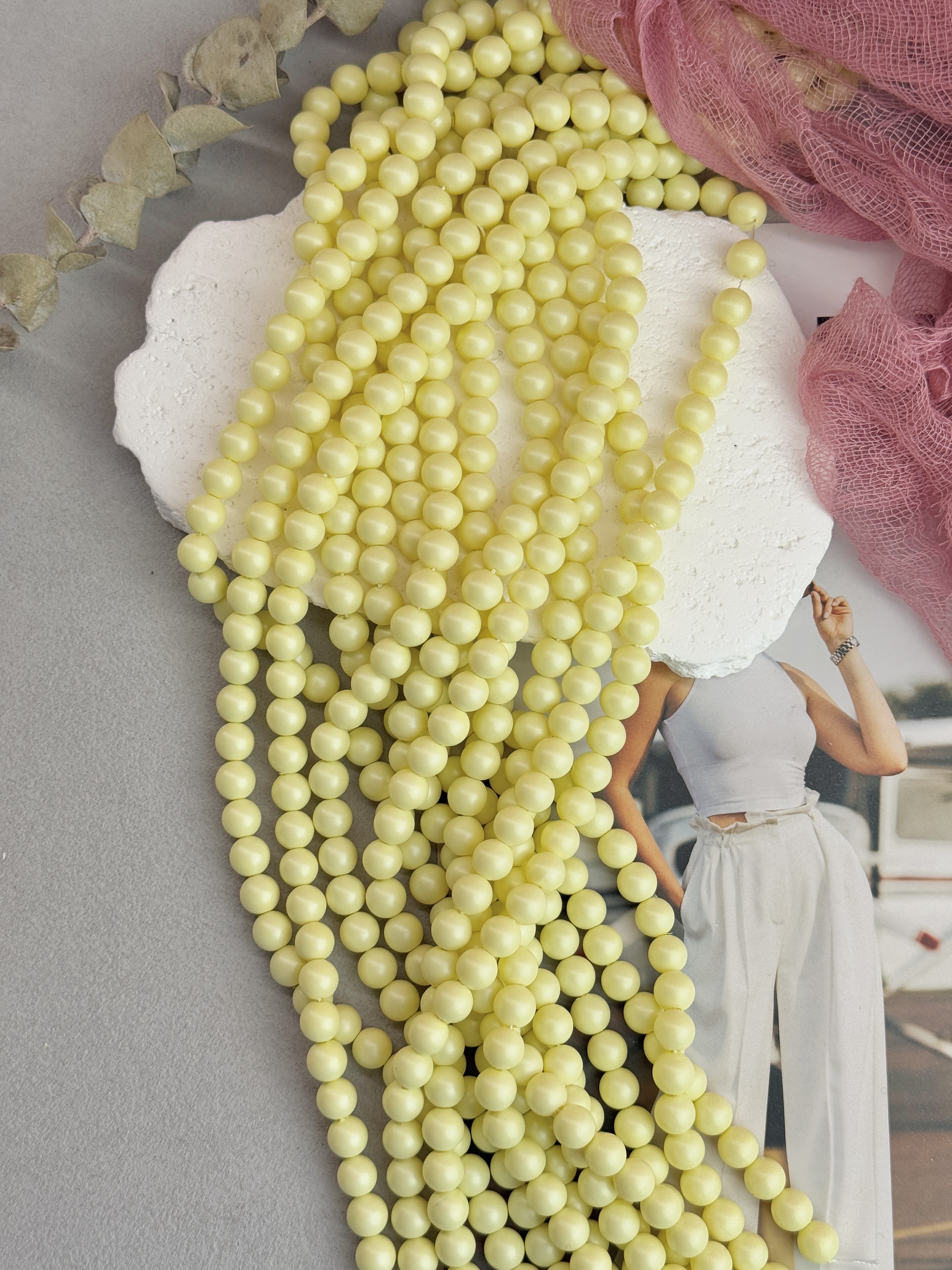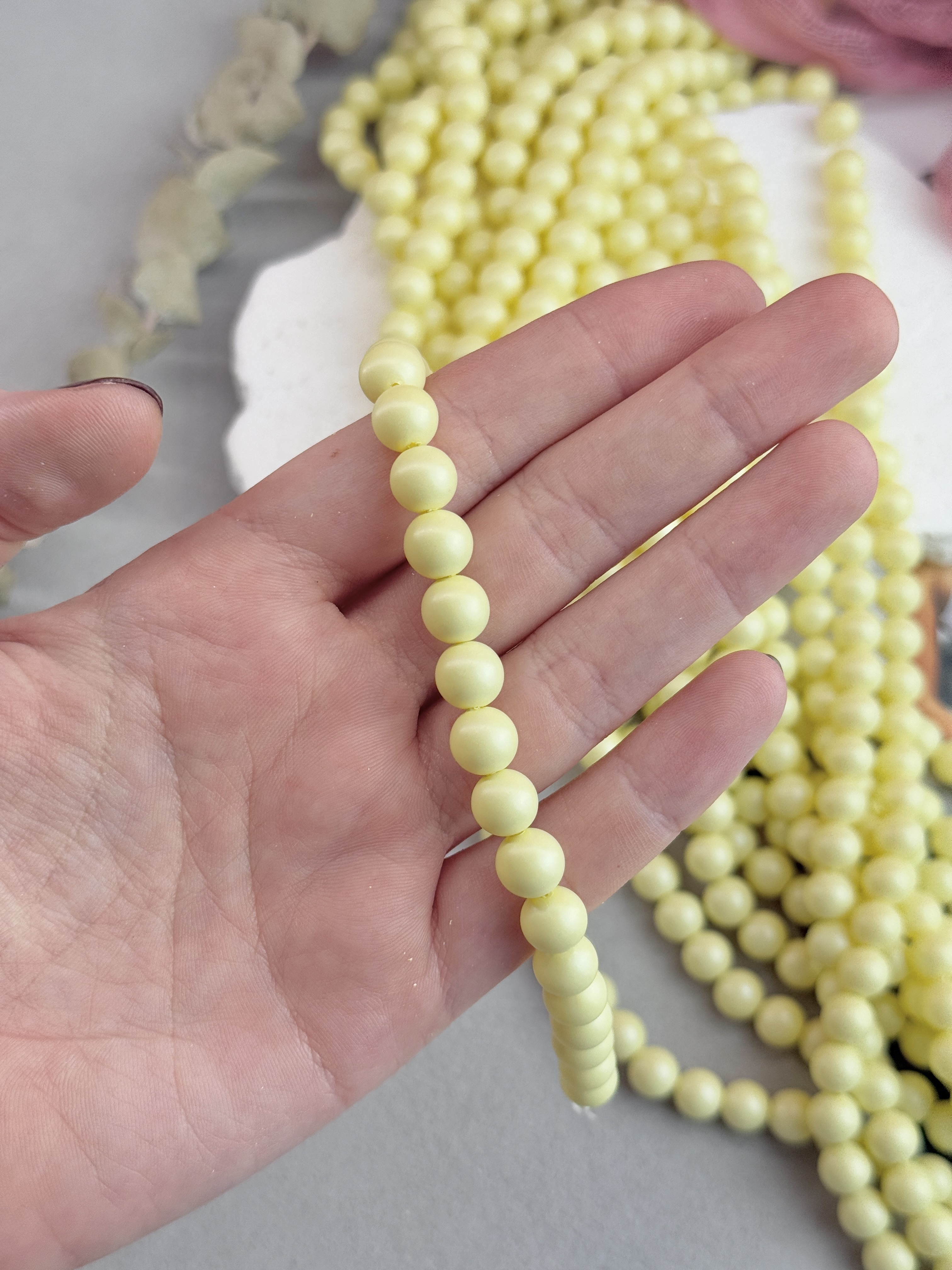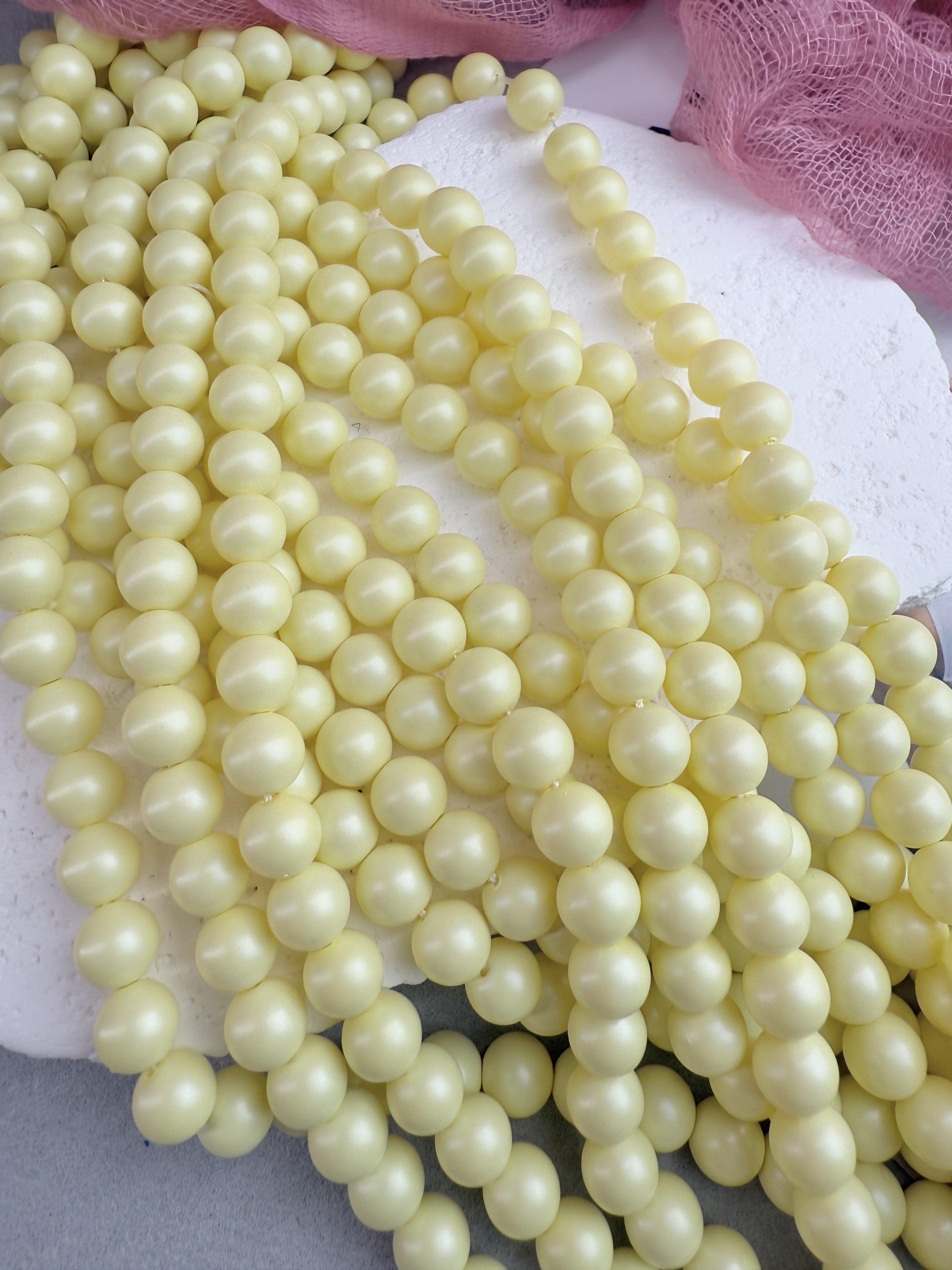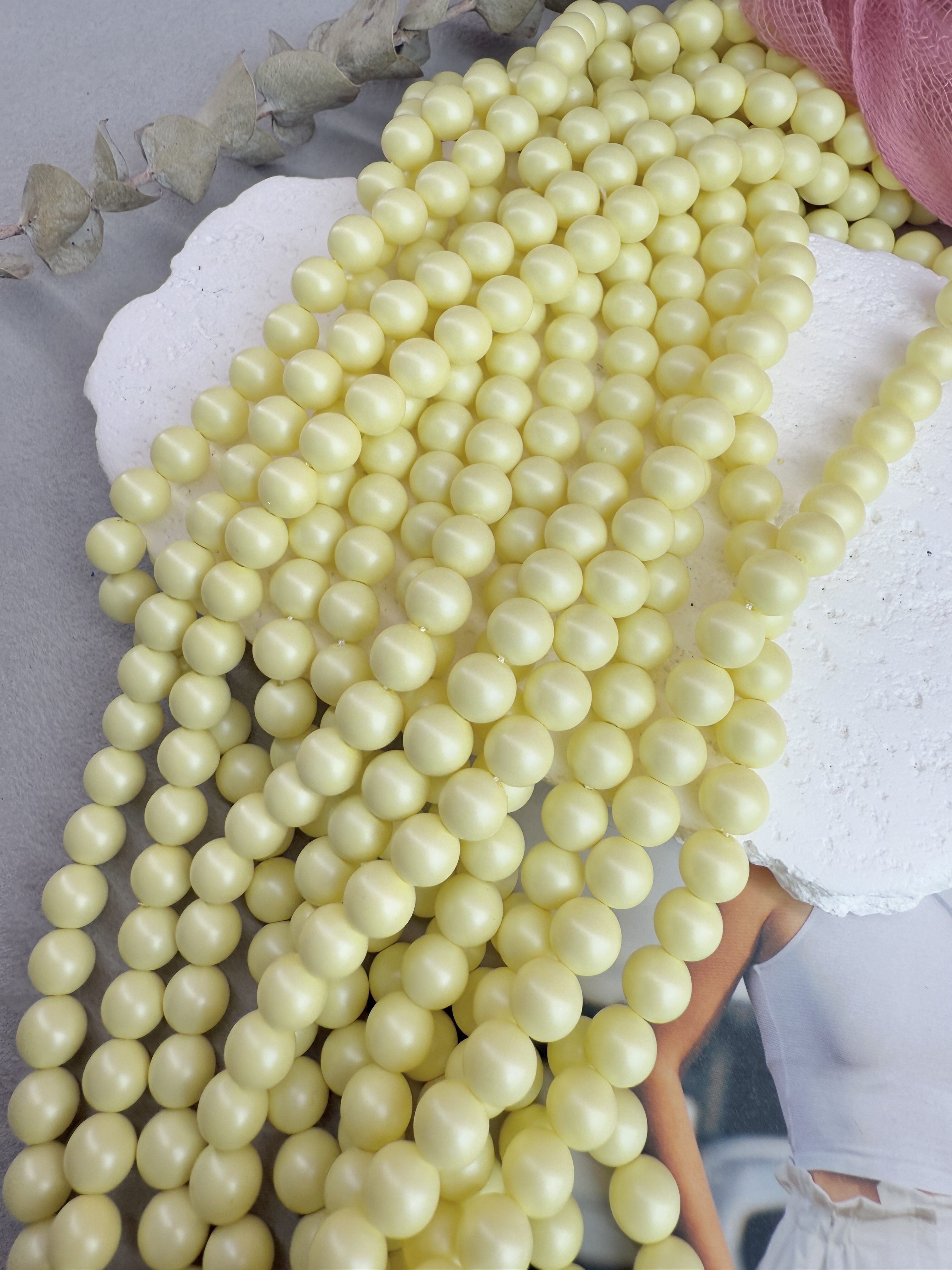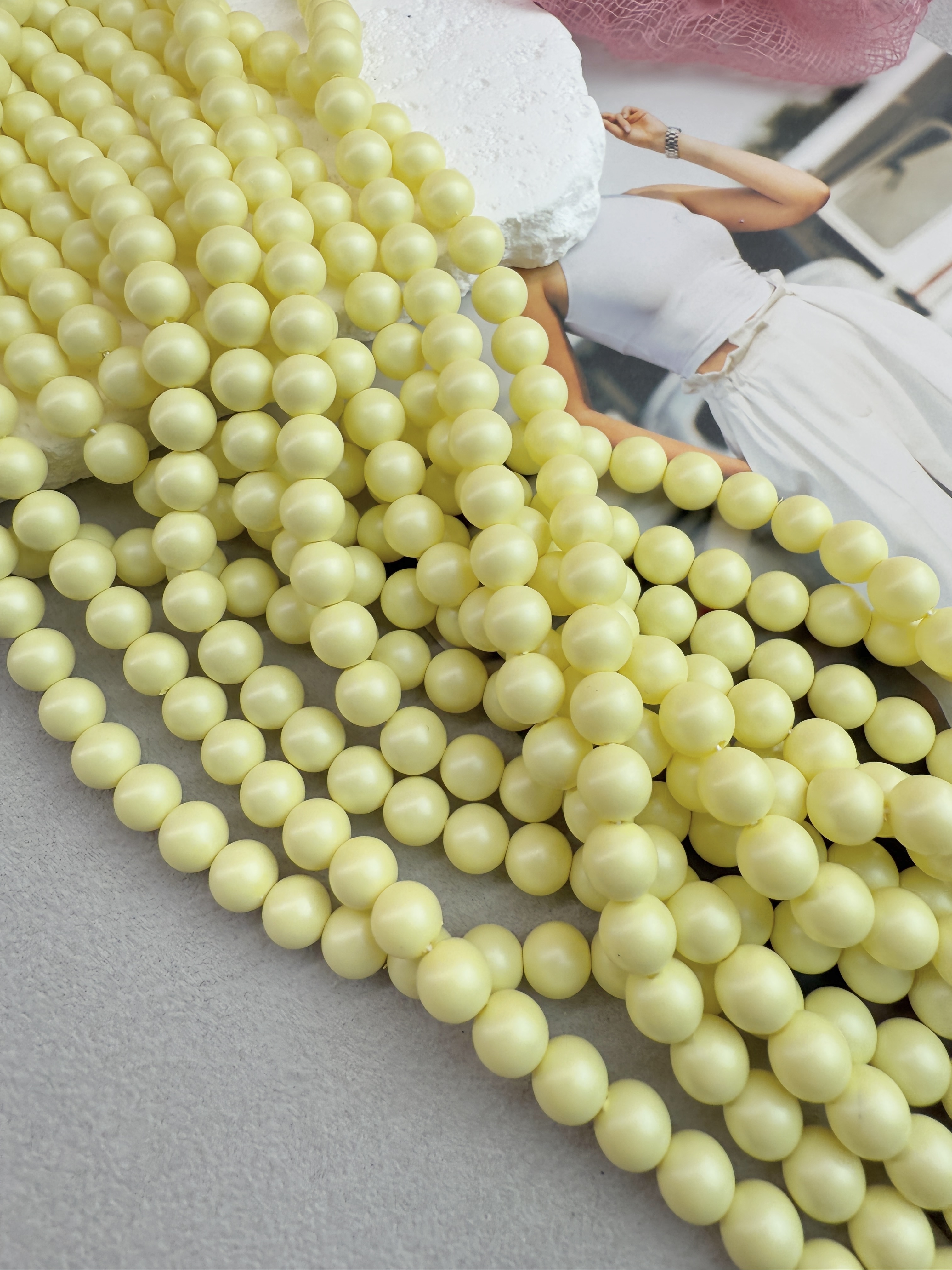 Стеклянный жемчуг с цветным покрытием, матовый. Продается на нити или россыпью. Подходит для вышивки и сборки украшений ручной работы таких как колье, серьги, ободки (не рекомендуем использовать данных жемчуг в браслетах и подвесах, а также других украшениях, где возможно сильное трение изделия). Размер 8 мм.